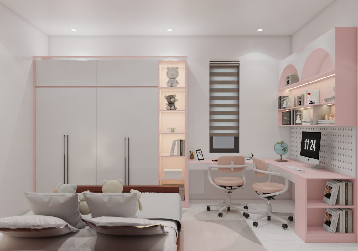 Nội thất tinh gọn: bàn học, kệ trang trí và tủ đồ đều được sắp xếp khoa học, không gây bức bí.