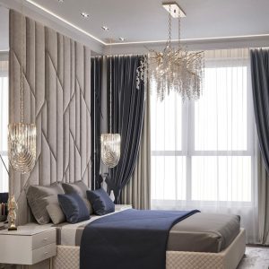 Điểm nhấn nổi bật trong căn phòng chính là mảng tường đầu giường được bọc nệm tạo hình khối độc đáo, kết hợp cùng gam màu xám trung tính, vừa tinh tế vừa hiện đại. Giường ngủ lớn bọc nệm cao cấp với bộ chăn ga màu xám và xanh navy tạo sự đối lập hài hòa, giúp không gian thêm phần cá tính.