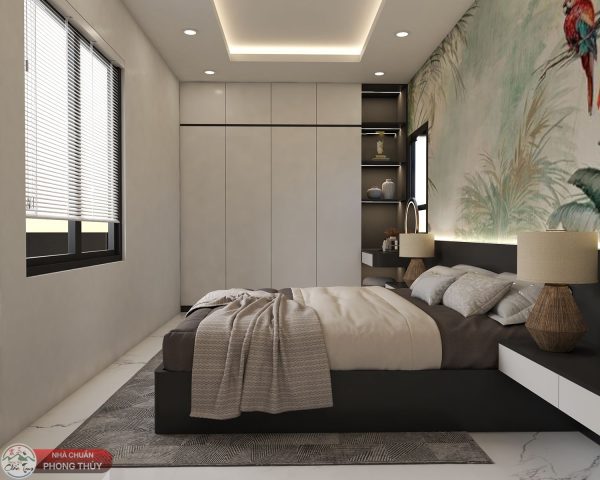 Giường ngủ được đặt ở vị trí trung tâm, đầu giường dựa vững vào tường – một nguyên tắc quan trọng trong phong thủy để tạo cảm giác an toàn. Hệ thống đèn ngủ đối xứng hai bên mang đến sự cân bằng, đồng thời hỗ trợ ánh sáng dịu nhẹ cho giấc ngủ sâu.