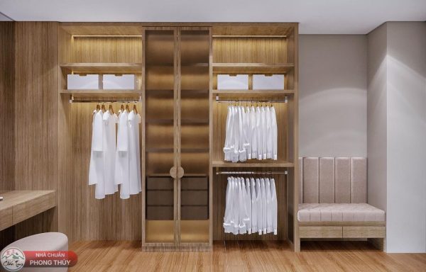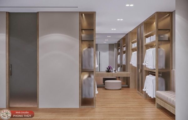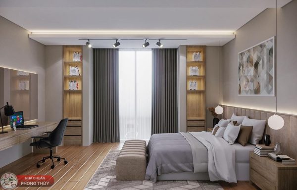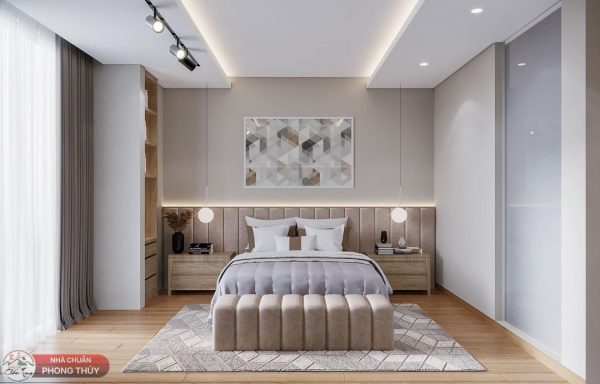 Giường ngủ được bố trí ở vị trí trung tâm, đầu giường tựa vững chắc vào tường, mang lại sự an toàn và ổn định theo phong thủy. Ghế dài đặt cuối giường vừa là điểm nhấn, vừa mang đến sự tiện lợi trong sinh hoạt. Hai tủ đầu giường kết hợp với đèn thả đôi mang lại sự cân bằng và đối xứng – chi tiết quan trọng trong bố cục phòng ngủ chuẩn phong thủy.