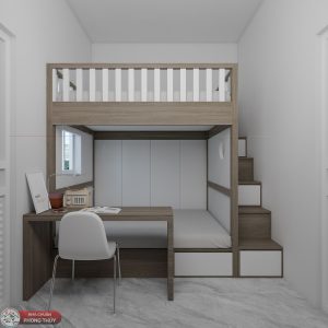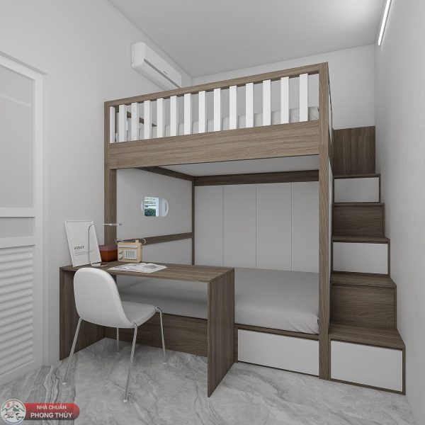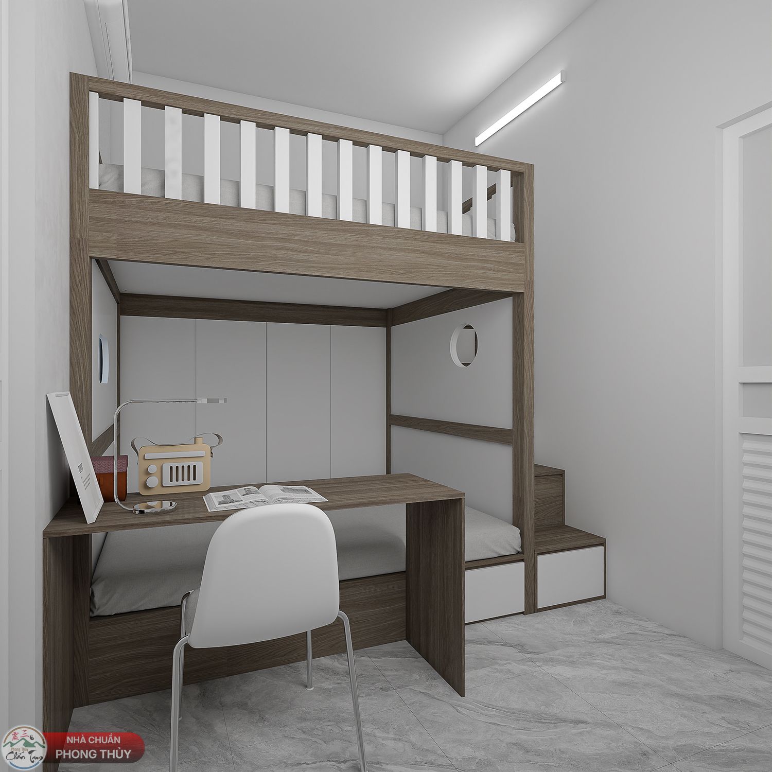 Không gian được thiết kế theo dạng giường tầng kết hợp bàn học và tủ lưu trữ thông minh. Giường ngủ đặt ở vị trí “tựa sơn” – đầu giường vững chãi vào tường, tránh đối diện trực tiếp cửa ra vào. Cầu thang gỗ chắc chắn vừa tạo cảm giác an toàn, vừa mang lại sự cân đối cho bố cục. Gam màu gỗ nâu kết hợp trắng chủ đạo giúp phòng ngủ thêm sáng sủa, tinh giản mà vẫn ấm áp.