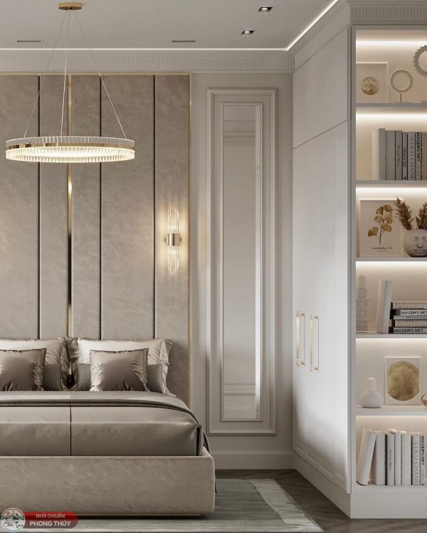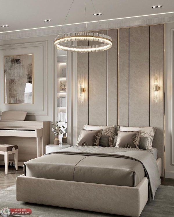 Căn phòng nổi bật nhờ gam màu be – nâu sang trọng, được phối hợp khéo léo để tạo sự ấm áp nhưng vẫn giữ được nét thanh lịch. Giường ngủ bọc nệm cao cấp cùng bộ chăn ga đồng điệu tạo cảm giác mềm mại và thoải mái. Đầu giường ốp nệm kẻ dọc, kết hợp cùng đường viền kim loại ánh vàng, giúp không gian trở nên hiện đại và nổi bật hơn.