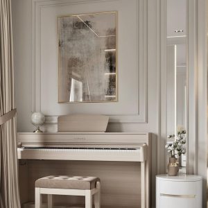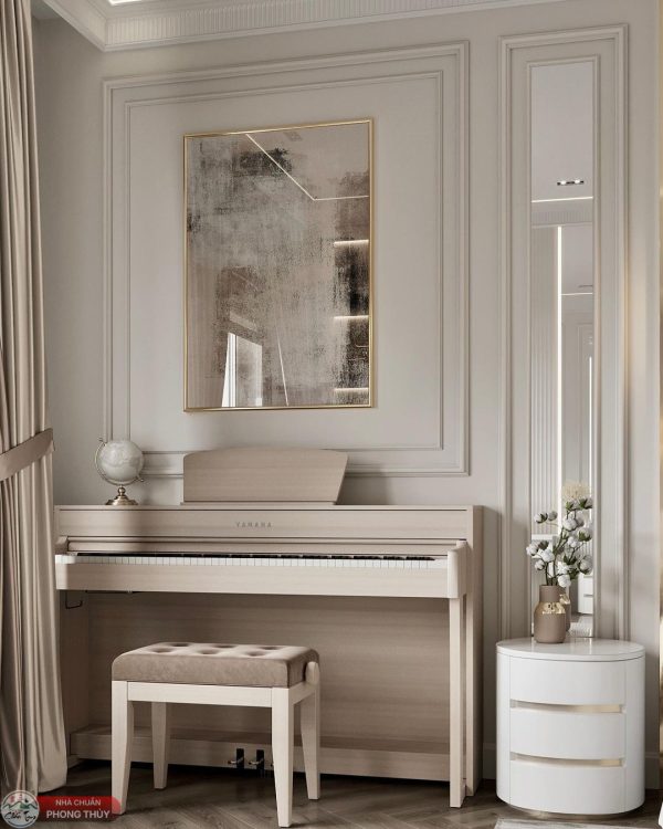 Bên cạnh tính thẩm mỹ, căn phòng còn được chú trọng tối đa về công năng sử dụng. Bàn piano nhỏ nhắn nhưng tinh tế mang lại sự thư giãn tinh thần; tab đầu giường thiết kế gọn gàng, tiện lợi để gia chủ dễ dàng lưu trữ đồ cá nhân. Thảm trải sàn và sàn gỗ cao cấp vừa mang lại cảm giác ấm áp cho đôi chân, vừa giúp căn phòng giữ được sự sang trọng. Mỗi chi tiết nội thất đều được lựa chọn và sắp đặt có chủ đích, vừa tiết kiệm không gian, vừa gia tăng tiện ích.