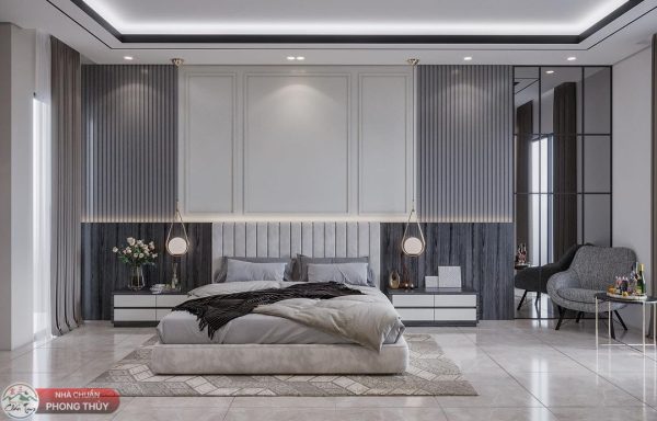 Đầu giường được thiết kế dạng kẻ dọc cao, tạo nên sự chắc chắn và cân đối, trong khi hệ thống đèn thả đôi hai bên giường vừa mang tính thẩm mỹ, vừa bổ sung ánh sáng ấm áp, tạo điểm nhấn hài hòa.