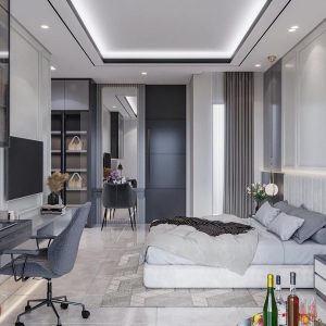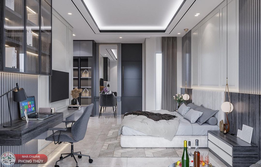 Phòng ngủ lấy gam màu xám nhạt và trắng kem làm chủ đạo, kết hợp với những điểm nhấn từ chất liệu gỗ tự nhiên. Sự tối giản trong màu sắc giúp không gian trở nên rộng rãi, sáng sủa hơn, đồng thời gợi cảm giác thư thái sau những giờ làm việc bận rộn.