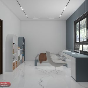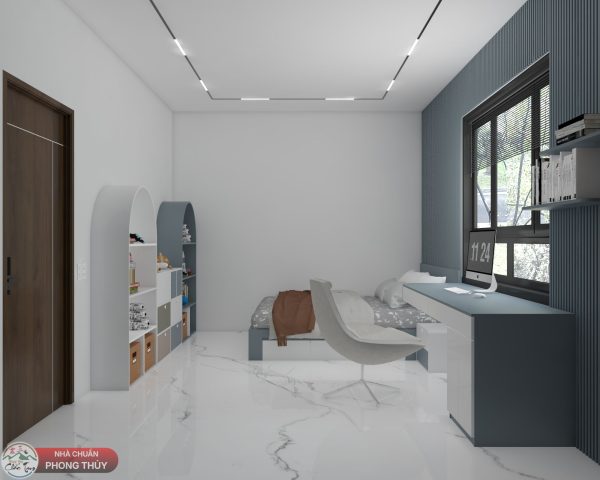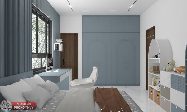 Phòng ngủ nổi bật với gam màu xanh xám hiện đại, kết hợp cùng trắng tinh khôi, tạo cảm giác thoáng đãng và mát mẻ. Đây là sự lựa chọn màu sắc thông minh không chỉ đáp ứng tính thẩm mỹ mà còn mang ý nghĩa phong thủy: xanh xám thuộc hành Thủy – tượng trưng cho sự bình an và dòng chảy năng lượng liên tục.